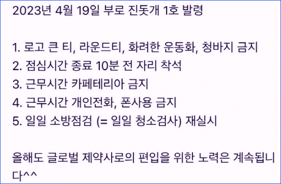 익명의 직원분이 올린 게시물에는 회장이 복장 규정 변경을 지시했고, 근무 시간 중에는 카페 이용과 개인 휴대전화 사용도 금지했다고 되어있는데, 지금 시대가 어느 시대인데...